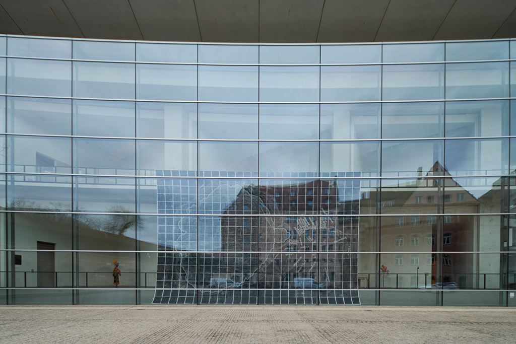 The exhibition space at the Hamburger Bahnhof is paved entirely in wood, engraved with the image of the Nuremberg map of Tenochtitlan. The wooden surface is also used as a matrix from which a one-to-one print of the engraved surface is made onto paper. The Atlas, a bound volume of the prints, is also shown in the exhibition.