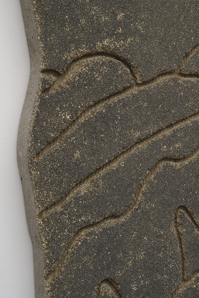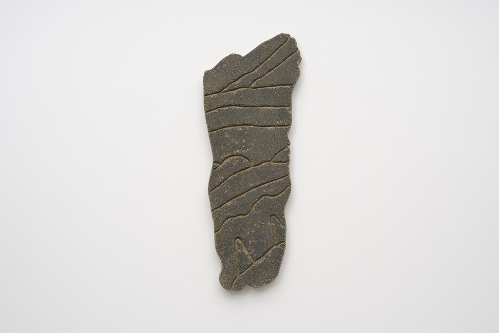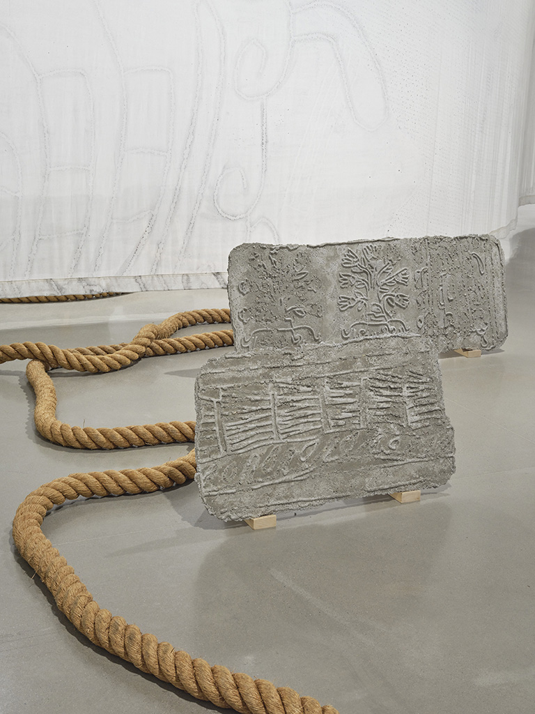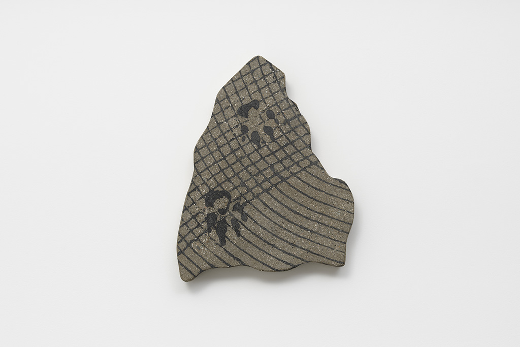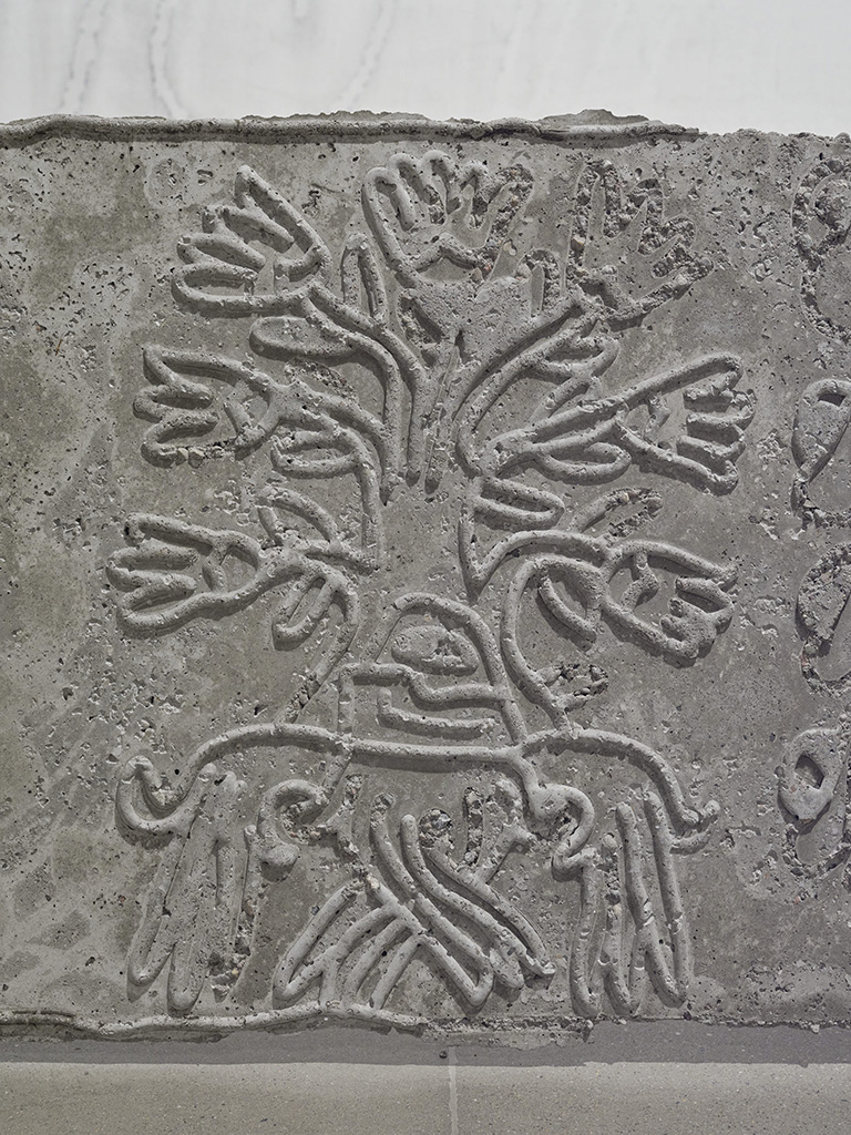 Hung on the walls is a series of ceramic works sketching the techniques the artist developed in collaboration with the construction team on site in Los Angeles. Together, they tested various methods for marking concrete surfaces, using ropes, brushes, stamps, and even their own hands to create the rhythm and textures that shaped the composition of the plaza floor. These ceramic slabs offer a close, detailed view of the artist’s process.