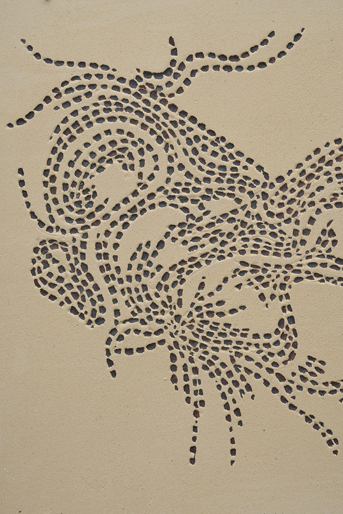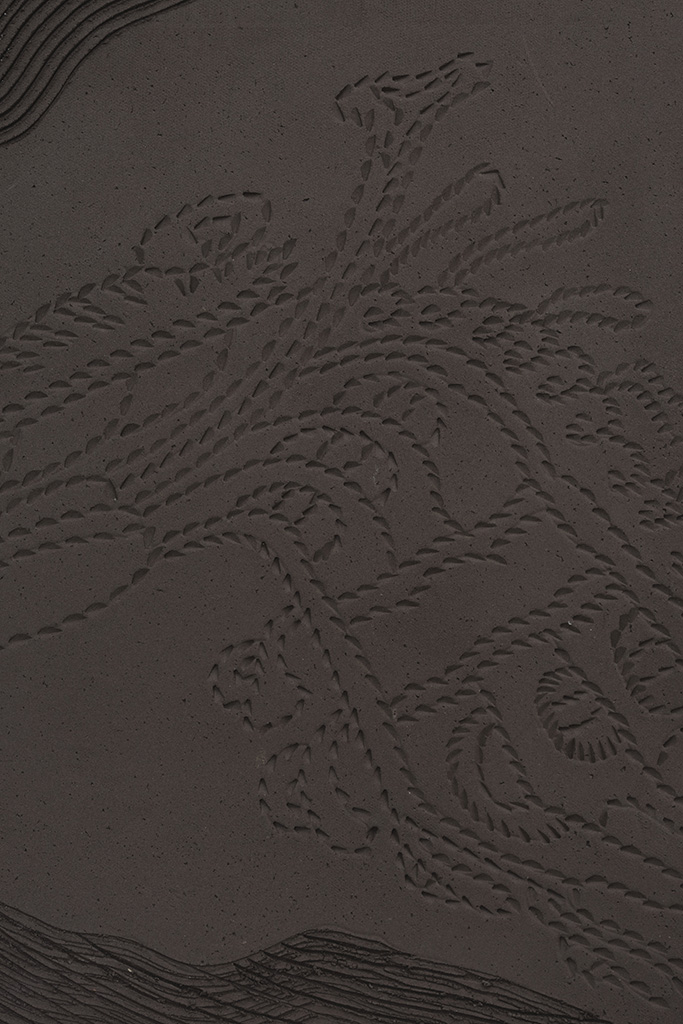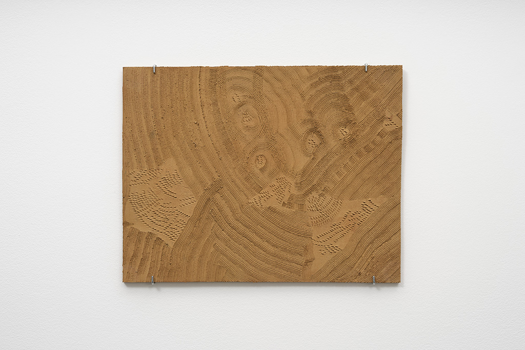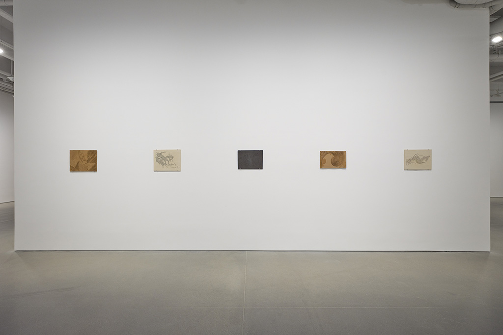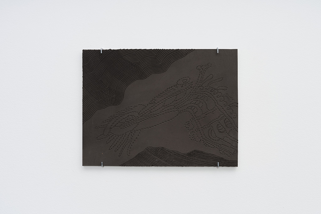 Hung on the walls is a series of ceramic works sketching the techniques the artist developed in collaboration with the construction team on site in Los Angeles. Together, they tested various methods for marking concrete surfaces, using ropes, brushes, stamps, and even their own hands to create the rhythm and textures that shaped the composition of the plaza floor. These ceramic slabs offer a close, detailed view of the artist’s process.