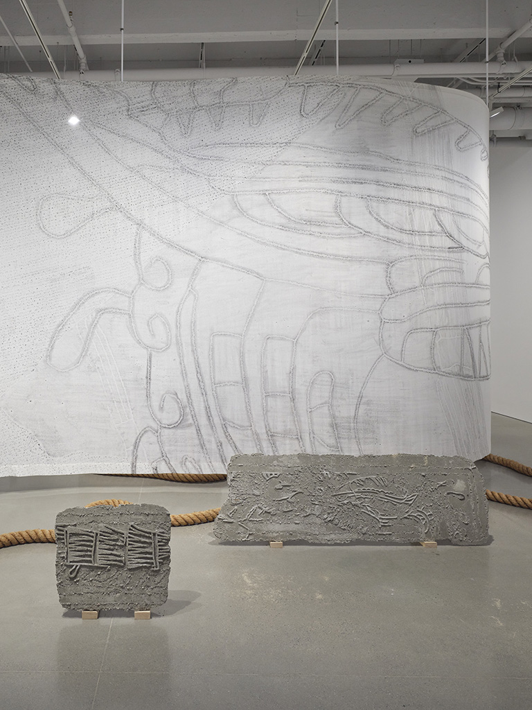 The exhibition presents a new vision of archaeology – one that acknowledges ghosts, double visions, and multiple versions of history. The artifacts unearthed through different research originate in local archives but gesture toward sites much further afield: the ancient Mexican civilization at Teotihuacan, ceramic funereal traditions of the Southwestern Mimbres culture and their echoes in Mayan pottery, and the carved stone reliefs of pre-Columbian cultures throughout Central America. Through large-scale fragments, rubbings, ceramics, and fresco works, Feathered Changes, Serpent Disappearances overlays and blends these disparate narratives, splicing them together into a collage of archaeological time.