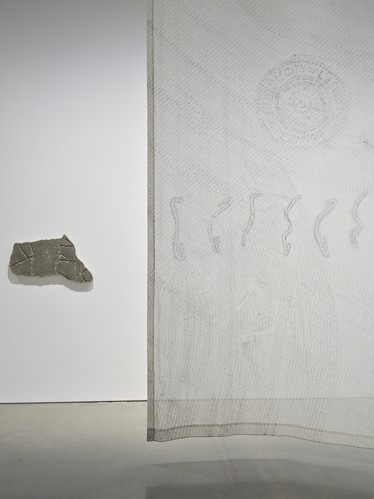 A large-scale textile unfurls through the gallery, created through direct frottage—rubbing fabric over a textured surface to capture its imprint—from the concrete pavement of the LACMA plaza. Acting as a palimpsest, the fabric accumulates impressions from multiple zones of the site, including infrastructural features such as manholes, producing a tactile mapping of the building’s footprint.