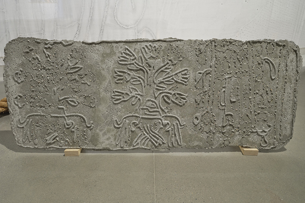 Visitors are first met by Feathered Serpent (2016), a concrete work that predates and conceptually anticipates the Los Angeles commission. Originally produced for the exhibition Feathered Changes, Serpent Disappearances at the San Francisco Art Institute, the sculpture reflects Castillo Deball’s research into the dispersion of Teotihuacan mural fragments into collections worldwide—an inquiry that connects archaeology, museum practices, and the circulation of artifacts across multiple institutional and cultural contexts. For many years, the Feathered Serpent—a mythological creature present in Mesoamerican cultures, symbolizing the connection between earth and sun, soil and water, place and transformation—has been a recurring motif in Castillo Deball’s practice, to which she returns through different means of expression.