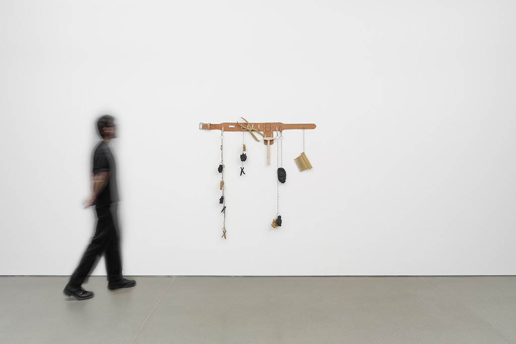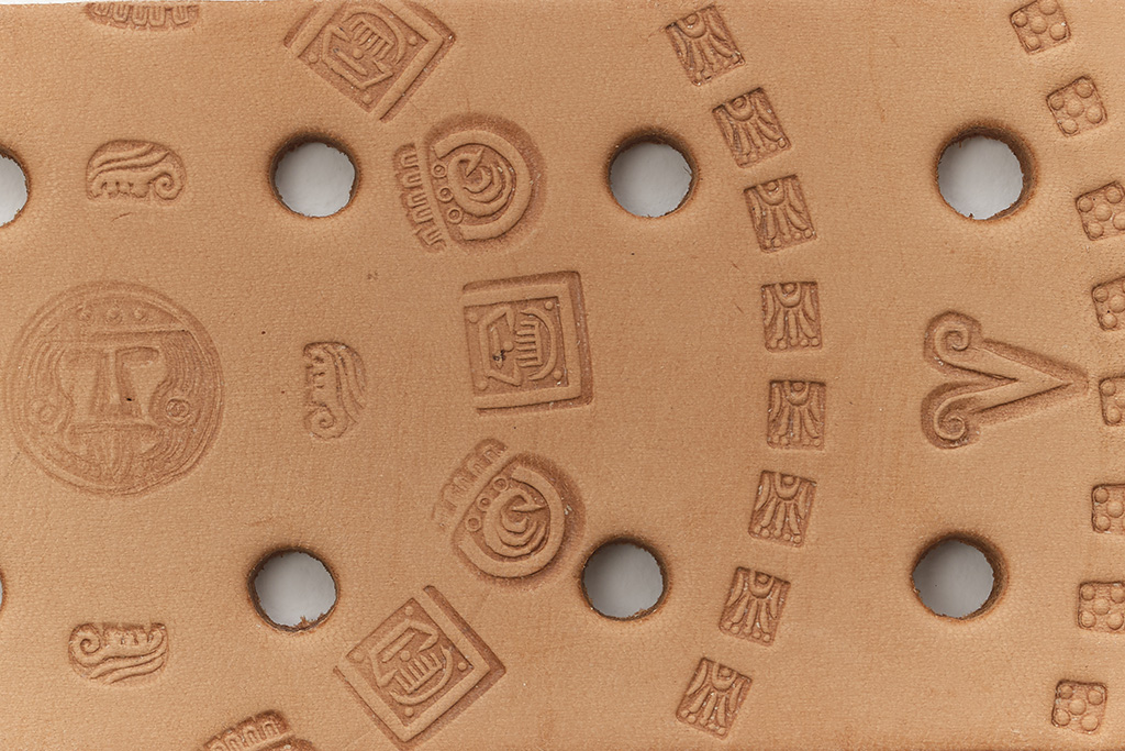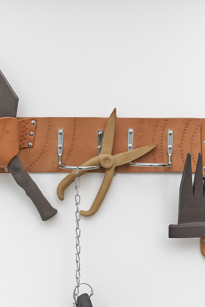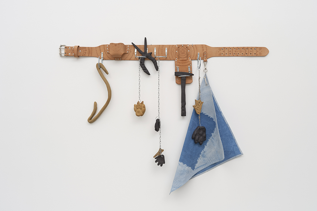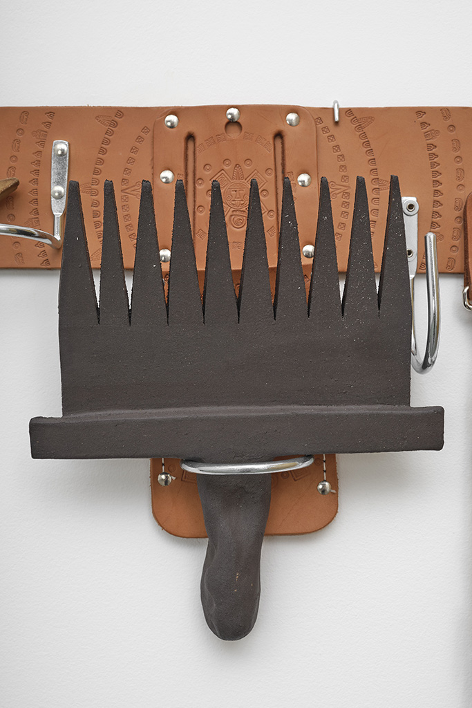 Construction workers wear leather belts to hold their tools; these waistbands are often customized with their names and personalized engravings—they function as individual, portable body-workshops. The artist customized a series of leather belts embossed with a modular metal stamp set of the Aztec calendar she found in downtown Mexico City. These belts hold ceramic pieces of human tools and animal paws including those of a beaver, snake, road runner, bison, wolf, raccoon, and bear.