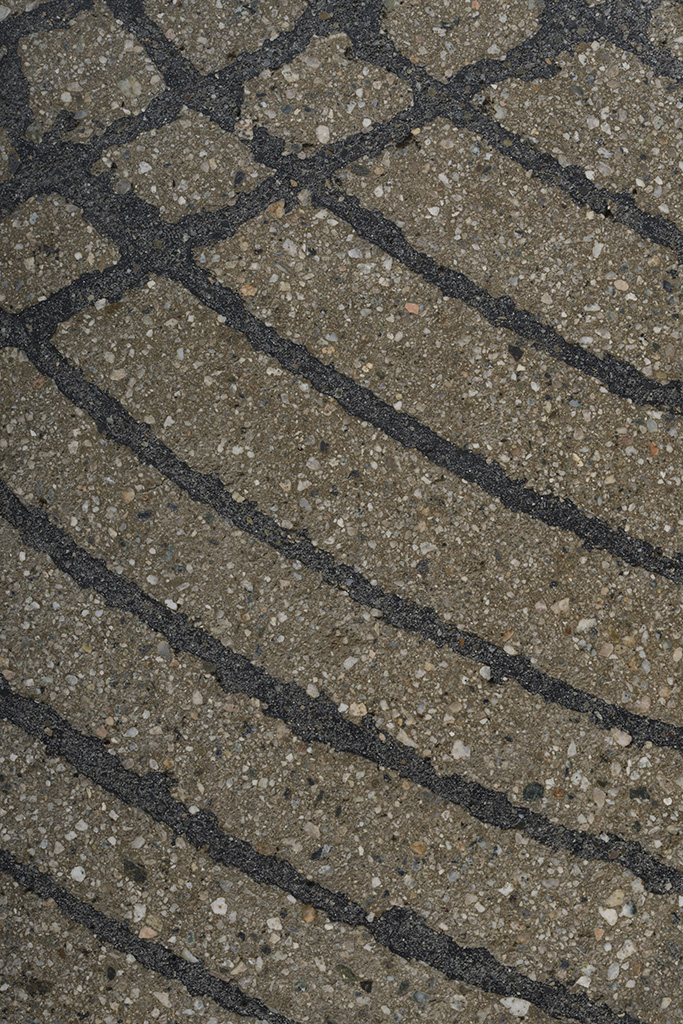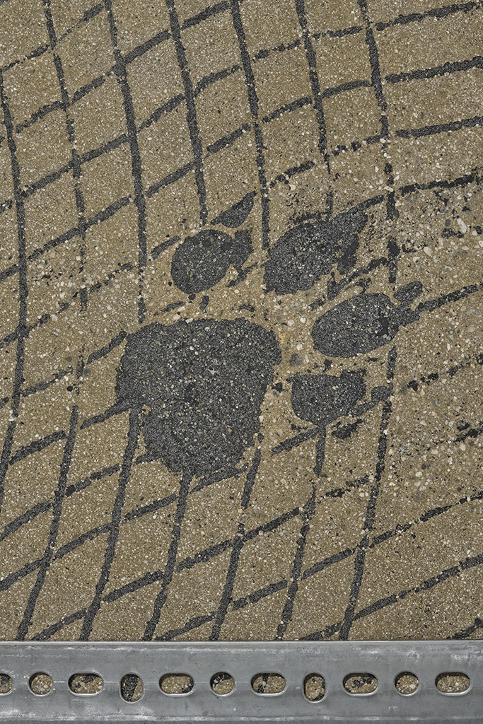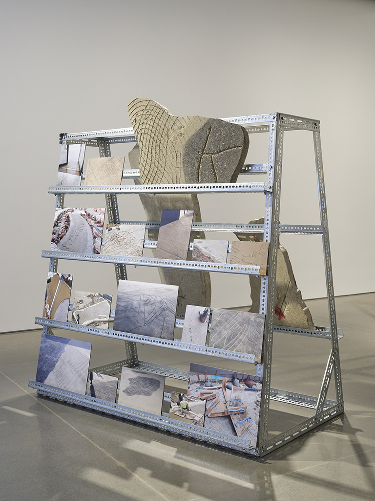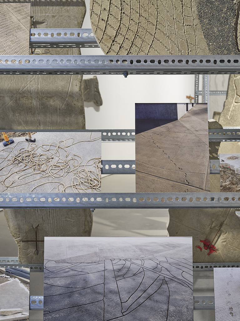 The exhibition concludes with a selection of concrete slabs poured on site in Los Angeles. Produced through the same brushing techniques as the previous ceramic works, these works record organic lines, rope patterns, and animal footprints. Installed on utilitarian metal shelving alongside photographic documentation of the plaza’s production, they form an index of gestures, materials, and collaborations from the construction process.