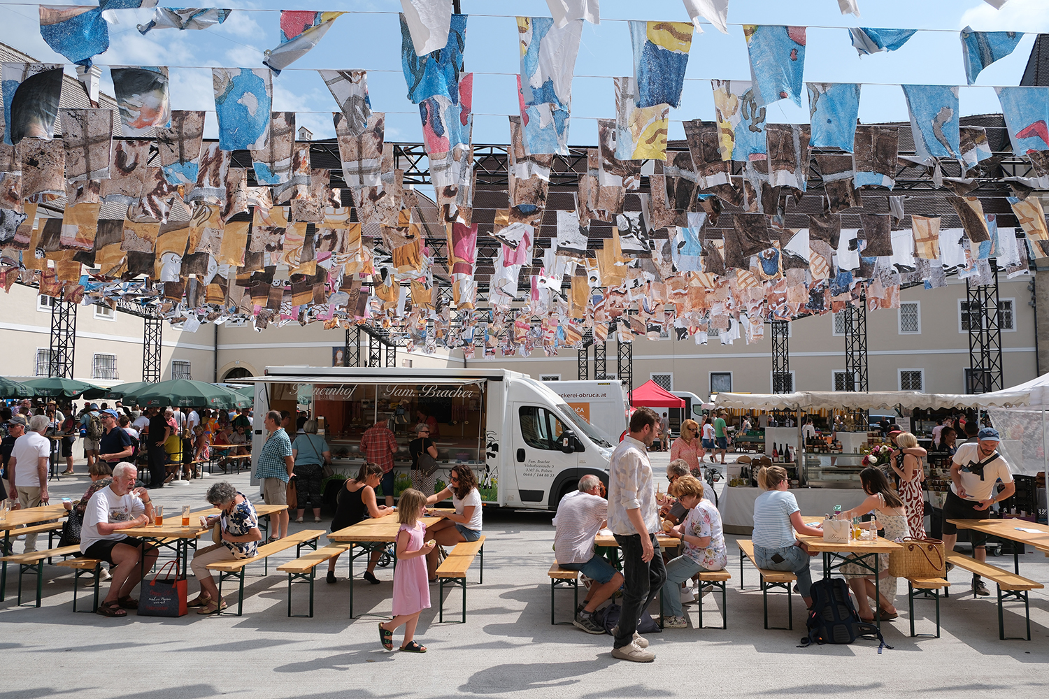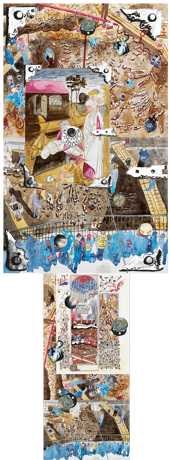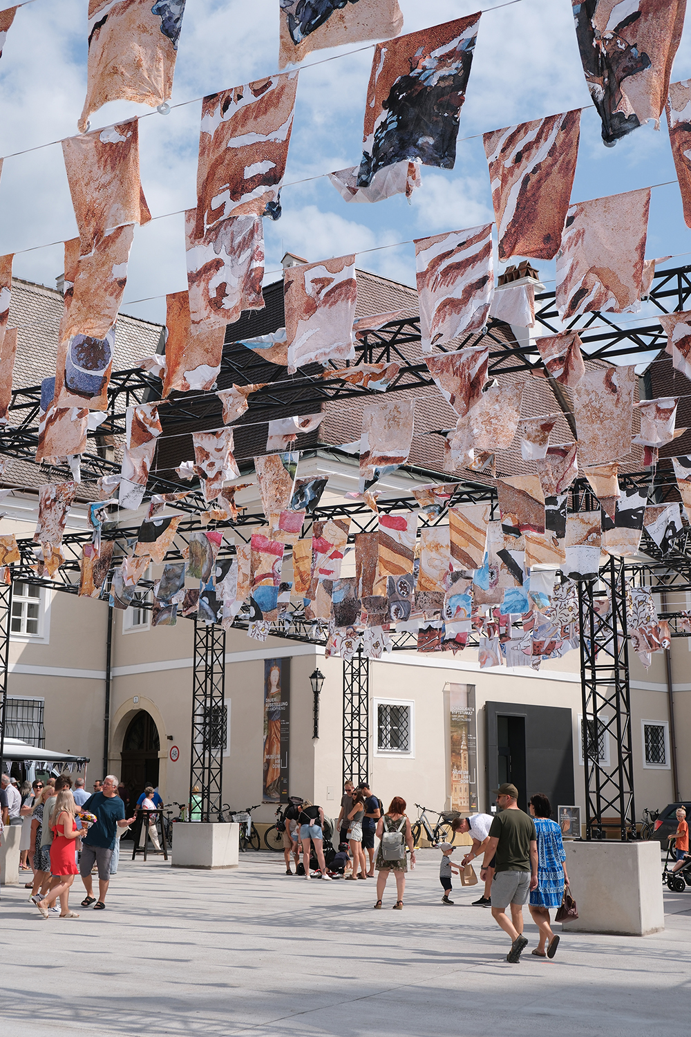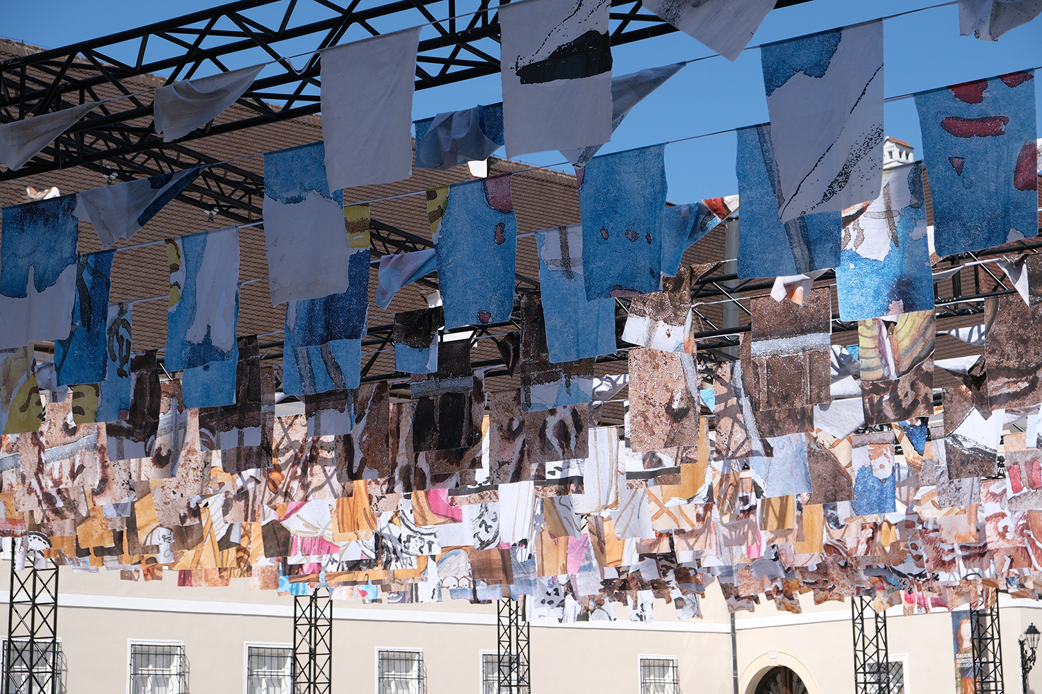 excavation site. During the excavations, not only were Roman and medieval buildings, but also the mortal remains of around 22,000 people were discovered who were buried in a cemetery at this site which was used from the 9th century until 1779. Mariana Castillo Deball's site-specific installation "Dead, I am Still Paper" explores the memory and materiality of the site through the history of paper production. Inspired by objects found among the bodies, the installation reflects on the ephemeral nature of materials such as fabric and paper. Deball links this theme to Goran Petrovic's novel "Paper with Watermarks" („Papir sa vodenim znakom“), which tells of the process of the "democratisation" of paper through the use of rags for its production and the history of the same material as a metaphor for vanity and transformation.