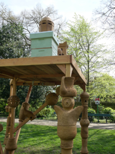 Located in Sebrechtspark, a public park in the historical centre of Bruges, Firesong for the bees, a tree of clay is an architectural-sculptural installation that hosts a beehive. The legs of this playful structure resemble columns made out of several ceramics in various curious shapes, stacked on top of each other. The top wooden platform is home to a colony of bees. Margot and Uther, the two beekeepers entrusted with the care of the bees, come to work on the platform every week.