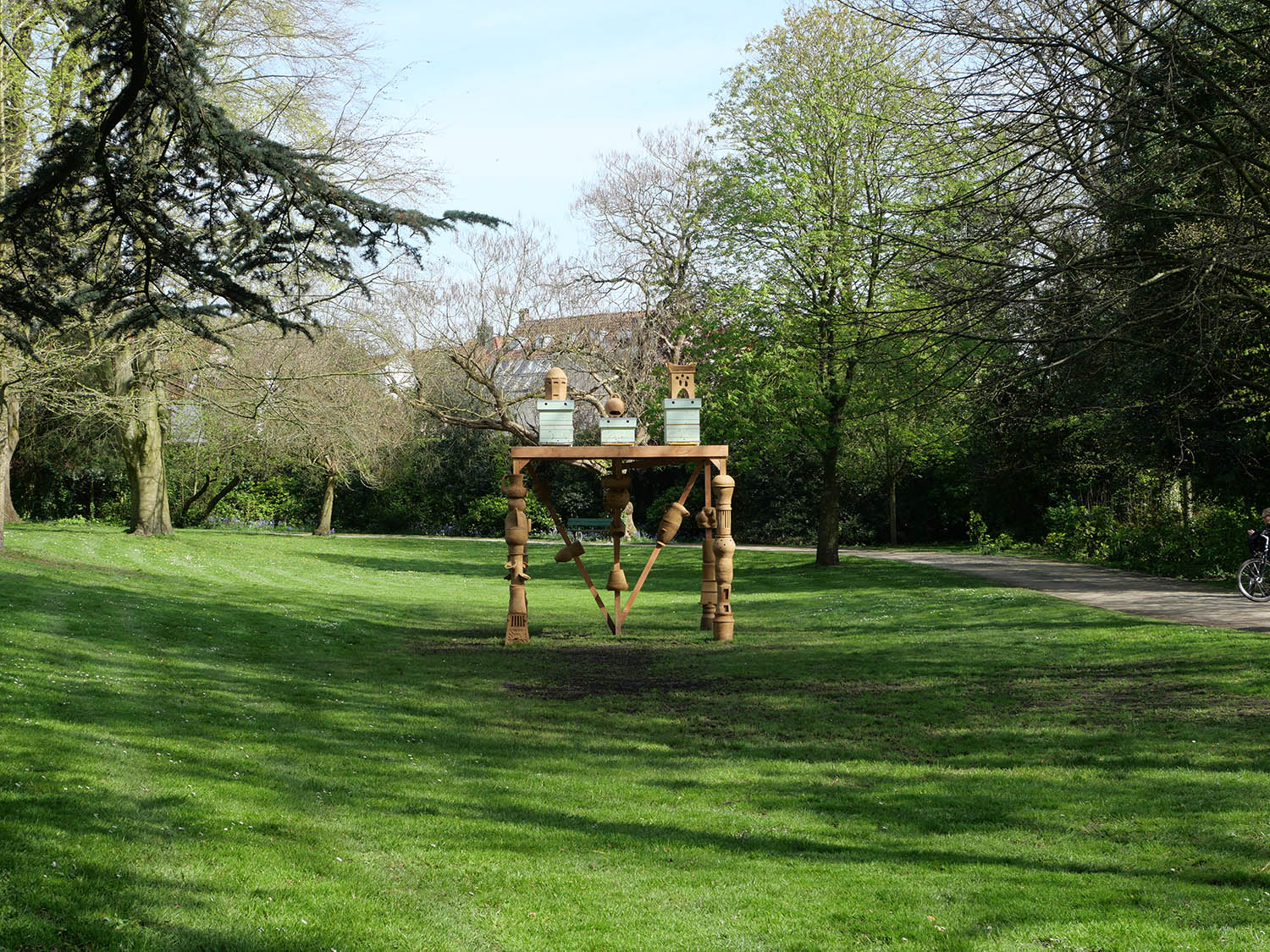In the bee-friendly city of Bruges, the artist collaborates with Biesous/ Margot Hinnekens and Uther Smis, an initiative of young bee keepers from the region, who care for the bees during the five months of Spaces of Possibility. The project is done with respect to the bees' wellbeing and the biodiversity in the park and the city. They will continue to take care of the bees after the end of the Triennial, when the artwork will be dismantled. Some of the elements of the structure will be donated to the apicultural circuit in Bruges, continuing their lives in the region.