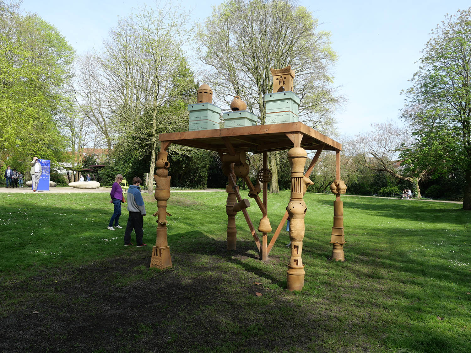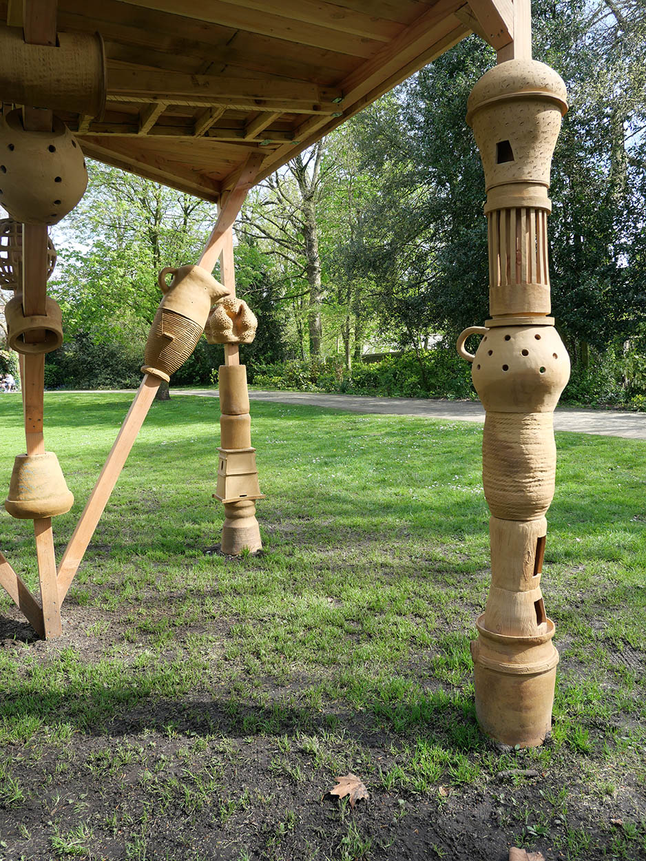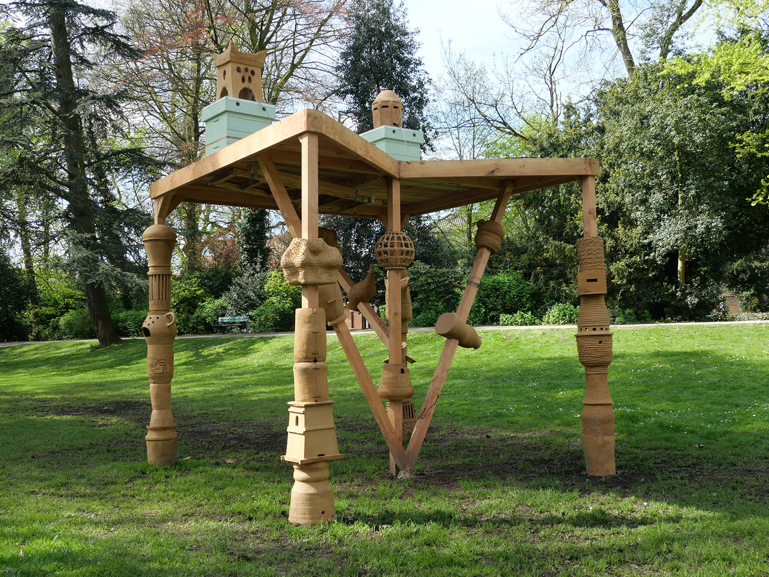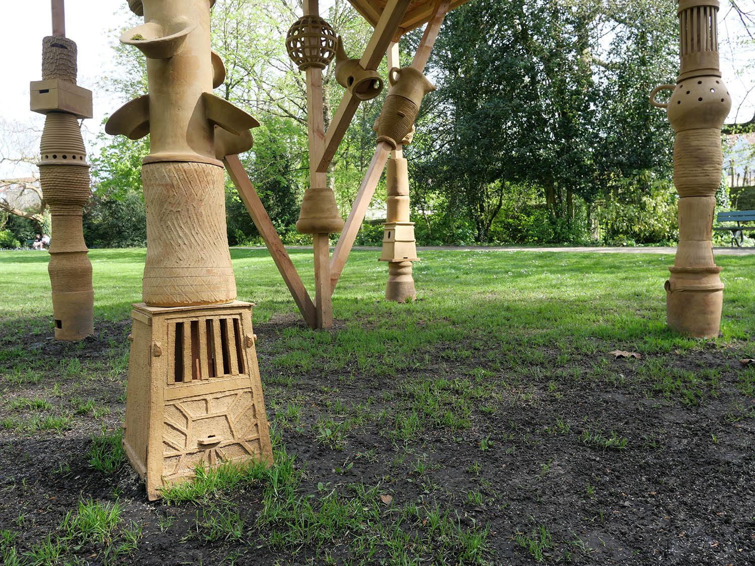 Located in Sebrechtspark, a public park in the historical centre of Bruges, Firesong for the bees, a tree of clay is an architectural-sculptural installation that hosts a beehive. The legs of this playful structure resemble columns made out of several ceramics in various curious shapes, stacked on top of each other. The top wooden platform is home to a colony of bees. Margot and Uther, the two beekeepers entrusted with the care of the bees, come to work on the platform every week.